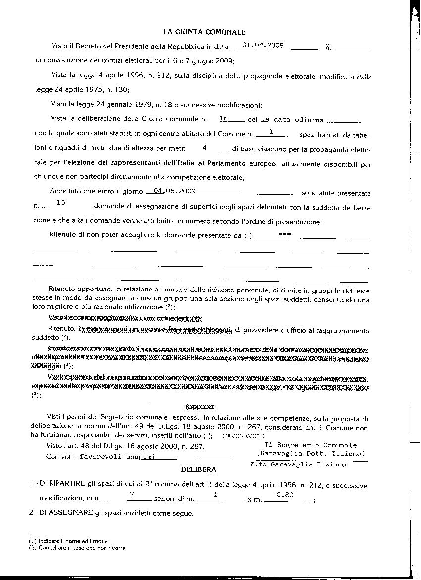 | Oggetto | Propagnanda elettorale. Ripartizione e assegnazione di spazi per le affissioni da parte di chiunque non partecipi direttamente alla competizione per l'elezione dei rappresentanti dell'Italia al Parlamento europeo del 6 e 7 giugno 2009 |